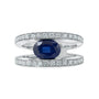 The L’Orée Bleu Horizon Ring is a bold expression of contemporary elegance, featuring a vivid oval blue sapphire gracefully suspended between two diamond set bands.